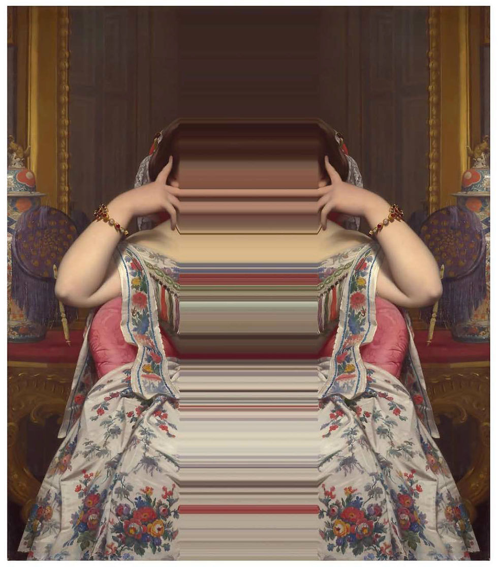 In this coming and going from the classic to the modern and vice versa, we find key figures from the social and popular circles of their respective eras, portrayed with the paparazzi that the technology of their era allowed them. On the one hand, photography in modern times was already established as a common practice, both in the work and technical fields, as well as in the artistic field; on the other... in the classical era, the painted portrait. The classical and neoclassical works of Ingres, Moroni, and Jacques Louis-Davide are subjected to algorithms and patterns unimaginable at the time of their conception, sometimes reducing their dimension and enhancing it in others. Furthermore, Ugalde subjects the film divas of Hollywood's golden age to these same interventions, giving them an elevated and expanded character of perfection; guided by classical aesthetic canons, such as symmetry and the study of human ergonomics.
